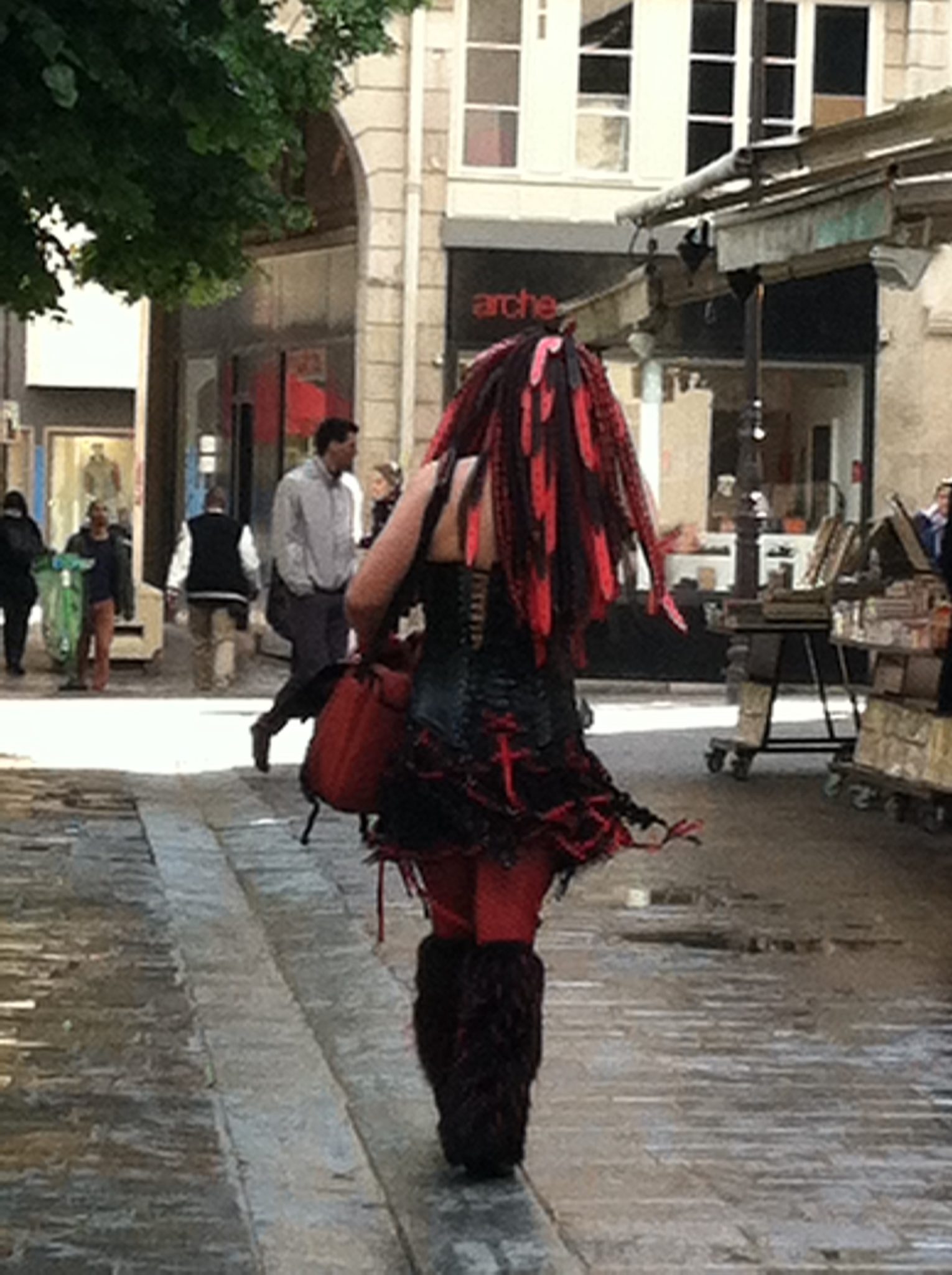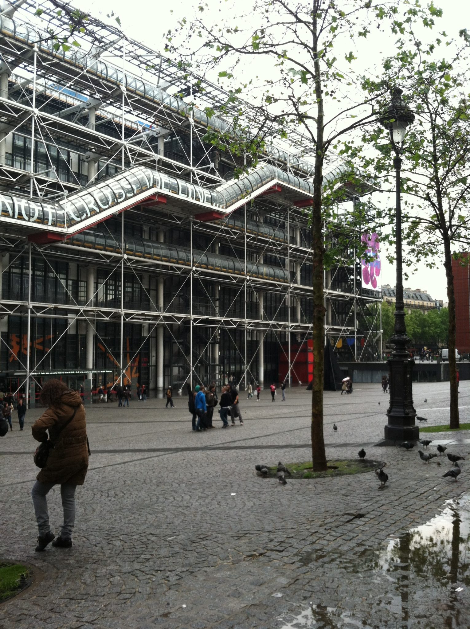 In French, there is an expression, “Il pleut des cordes,” which literally means, “It is raining ropes.” It’s roughly equivalent to “It’s raining cats and dogs.” When it started to rain, we decided it was a great time to take a coffee break. Cafés are an integral part of culture in France. People go there to relax, to meet friends, to work, and to people watch. Most cafés have indoor and outdoor seating. Because of the weather, we sat inside. The news this morning reported that France is experiencing the coldest spring since 1987! When the rain stopped, we continued on, passing the Centre Pompidou (a contemporary art museum), some interesting people, and this deceptively fenestrated building.