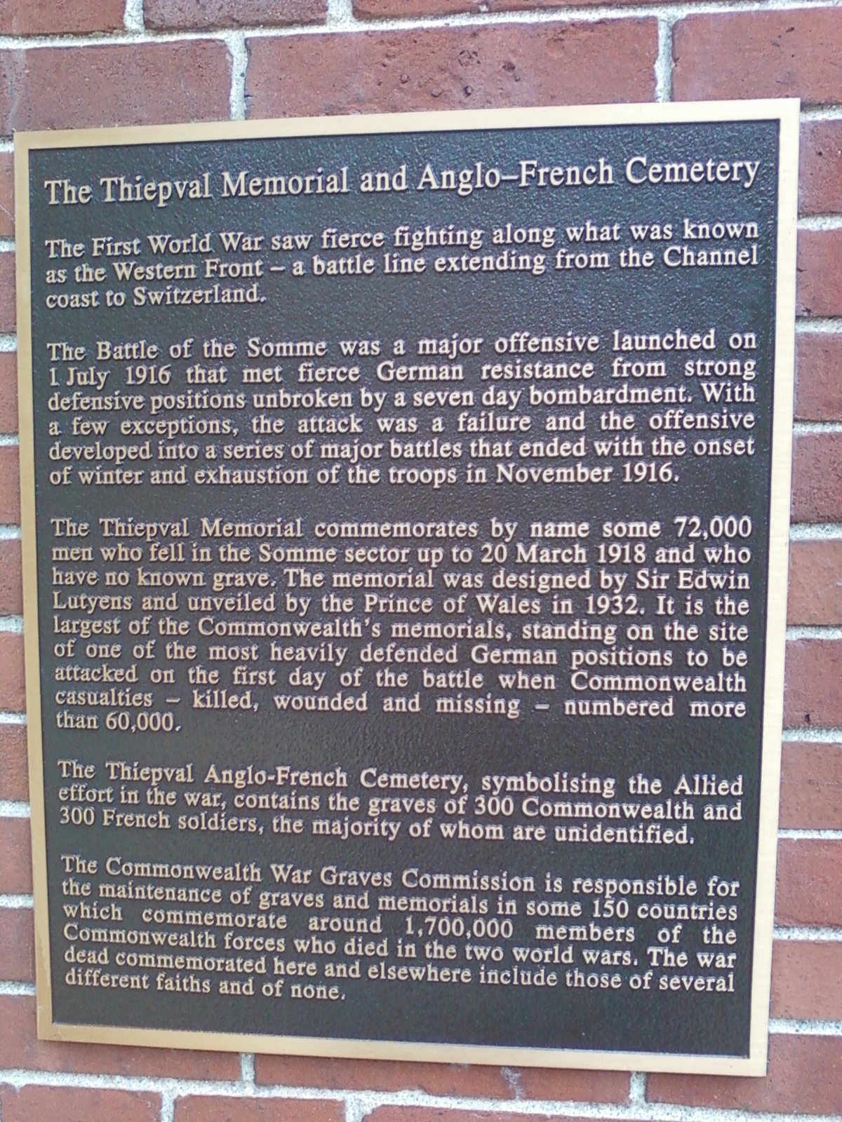 As a representation of The Battles of the Somme, the Thiepval Memorial truly does give an accurate impression, as by representing every man that went missing in the battles it gives some people the sense of the war not being over yet. It does honor the memory of the missing, but the war can never really be over and give everyone closure until all of the names on the walls of Thiepval are accounted for – even in modern times, the war is still ongoing in the hearts and minds of the people who knew the deceased. To have such an overwhelming structure that stands over the rest of the land, the Thiepval Memorial could also act as a representation of the men who stood to protect the country and still remain on this land as guardians, with their duty ending once the body is found and given a proper burial. As the stone in the middle of the memorial says, “Their name liveth for evermore.” These soldiers will continue to exist in memory until the day when they are found and put to rest, and their battles, finally, put to an end.
