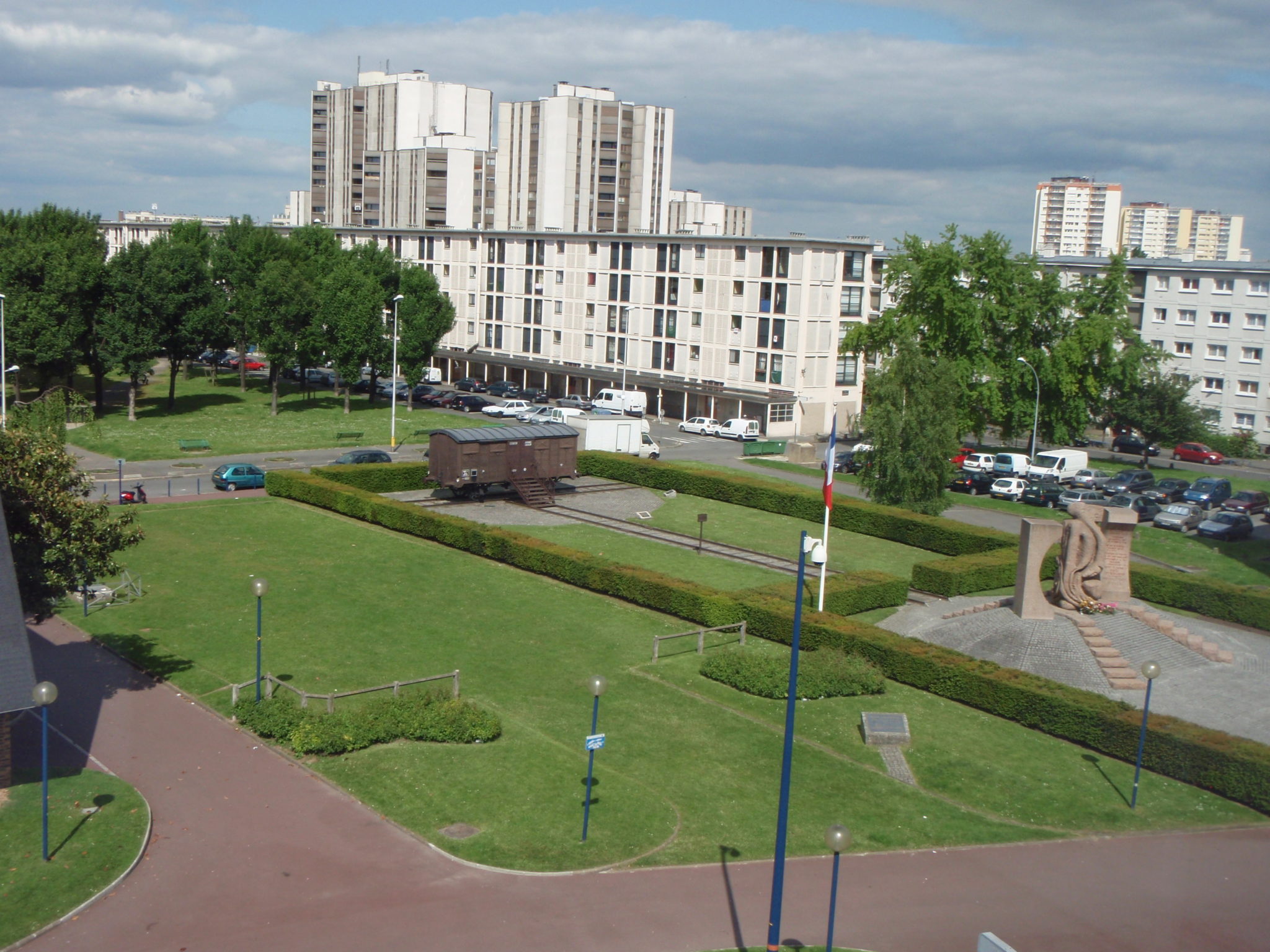 So on Sunday, I took advantage of the free shuttle service provided by the Mémorial de la Shoah (Holocaust Memorial) in Paris and travelled to Drancy for a guided tour of the site and the new museum. We began our tour outside, looking at the building (that was classified as a historic site in 2001) and the earlier memorials on the site. In the area in front of the Cité de la Muette there is a sculpture as well as a railcar like the ones used to deport Jews to the death camps.