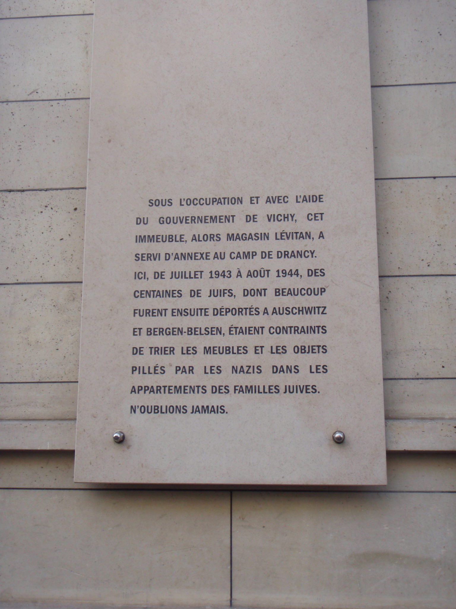 One of the videos talks about the three camps in Paris that were annexes to Drancy. Jews that were considered “non-deportable” because their spouse was “Aryan” or because of their previous military service were transferred to camps within Paris where their job was to sort and package the domestic items looted from Jewish apartments. (For more information on this topic see this book.) I was reminded that one of these camps was in a furniture store called Lévitan located in the 10th arrondissement of Paris. The building with its memorial plaque is less than a block away from the hotel where we are staying.