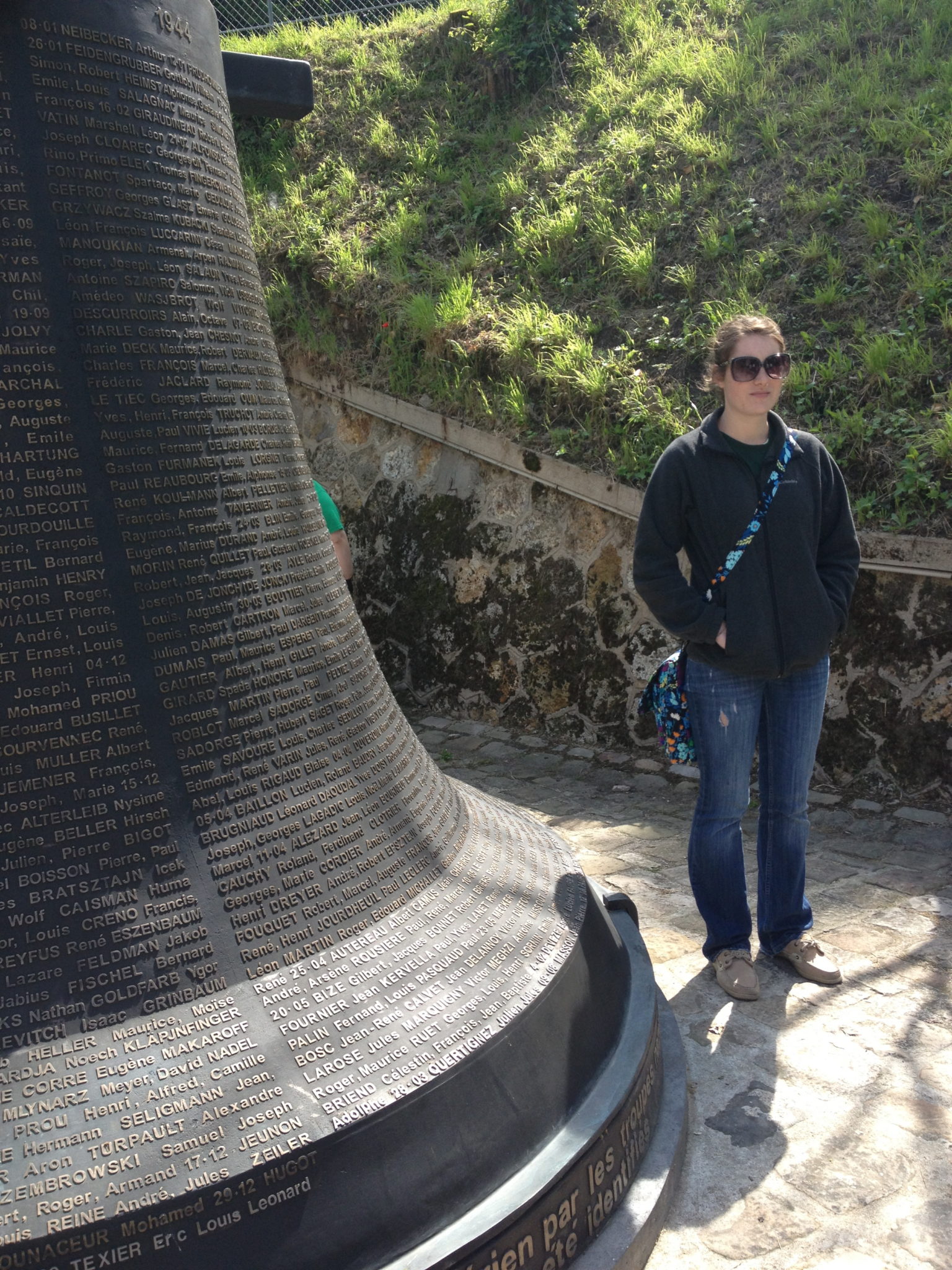 The beginning of our exploration of Mont-Valérien began with the tour guide telling us a brief history of the fort. It was built in 1841 when King Louis Phillipe was ordering forts to be built around Paris in order to have a better defense system. 16 forts were built (Mont–Valérien is built on the highest ground) in the shape of a star for strategic purposes, making them almost impenetrable. The points made it easier to not only defend Paris from enemies but also spot them as they approach. Mont-Valérien has 2 ½ km of walls and during the 4 year Nazi Occupation the fort was used as an execution site. [The victims executed were resisters and hostages taken in reprisal for Resistance activities, mainly Communists and Jews.] I found all of this information very enlightening considering the very few things I knew about the fort before the tour. Next, we went inside the memorial and up the stairs. Our first stop was at a tunnel where they used to keep the animals that helped build and run the fort. On the other side of that tunnel was where the actual executions took place. Afterwards we went up the stairs until we reached the top of the hill. The area was very peaceful and heavily forested. The top was cleared and there stood a museum, a church, and a bell-shaped monument.
