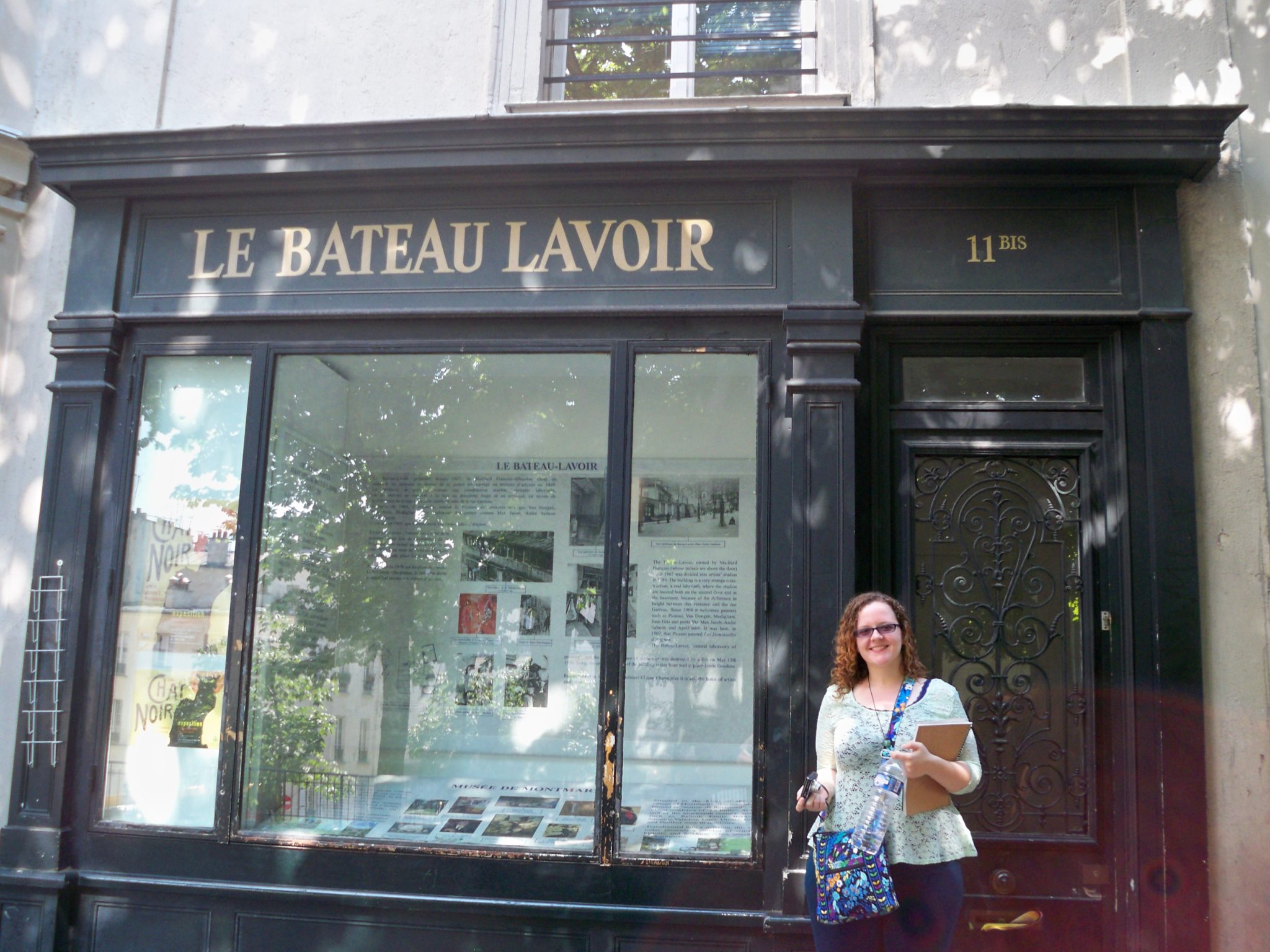 Courtney standing in front of Le Bateau-Lavoir where Modigliani and Picasso once lived and worked in an artist commune.