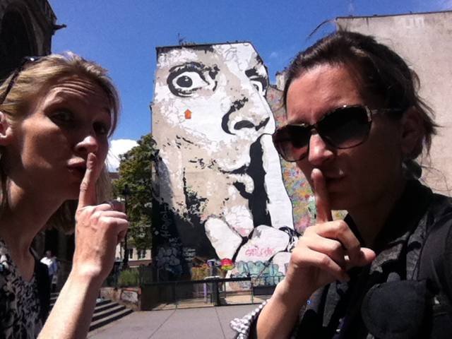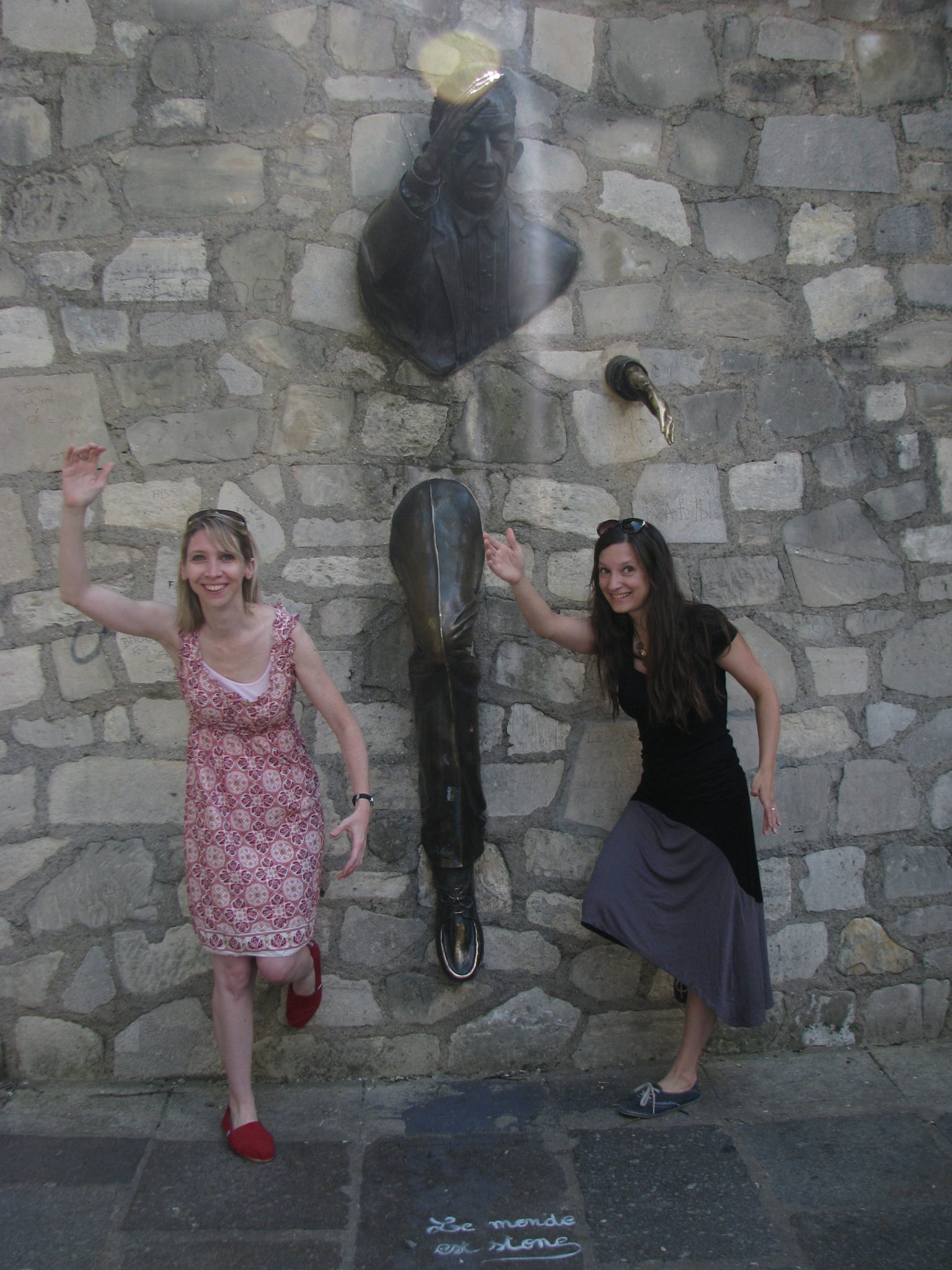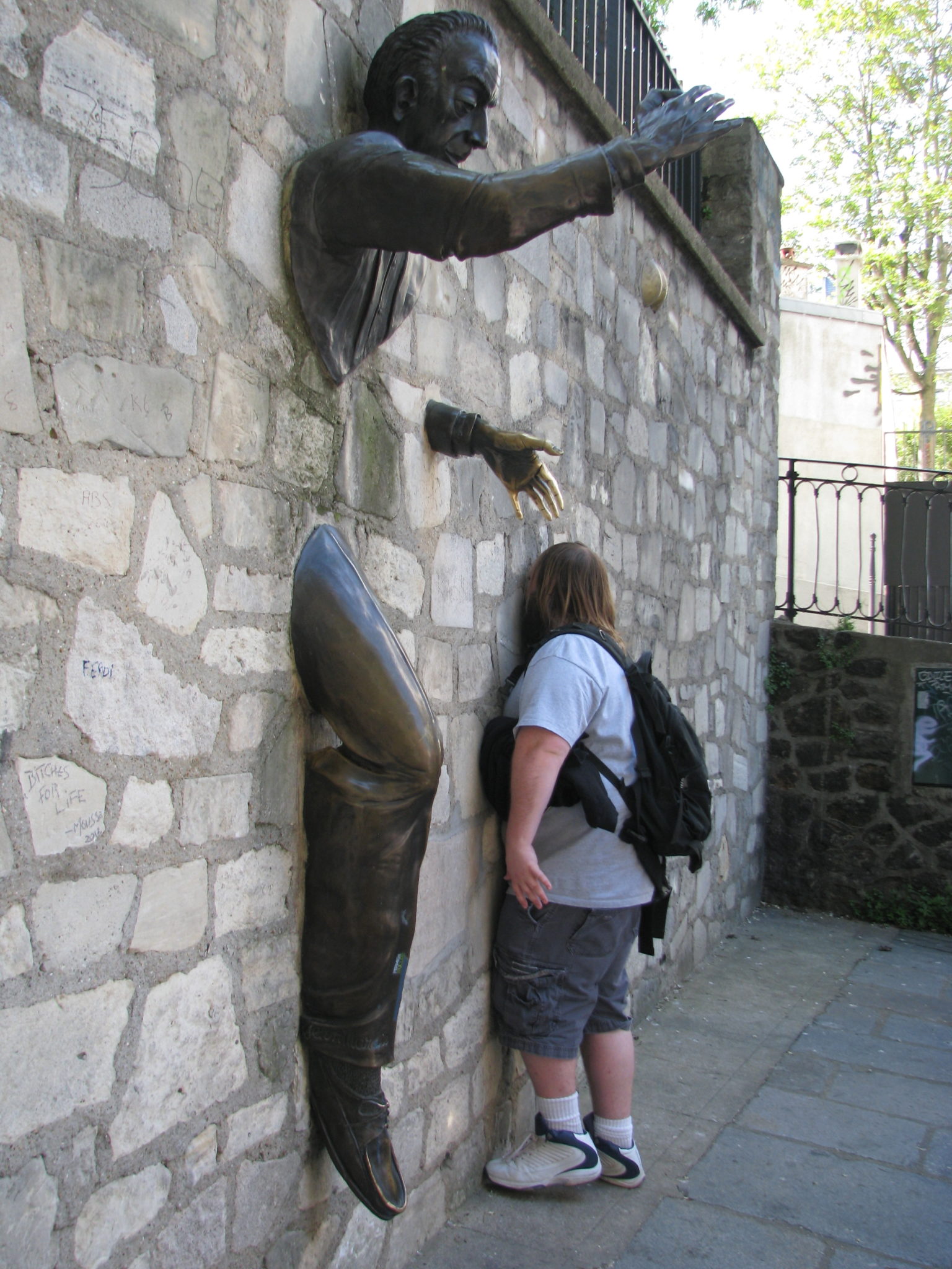 One of our literary readings for the course was an excerpt from Marcel Aymé’s The Transient Hour, a novel set in Occupied Paris. In addition to his war stories, Aymé wrote many fanciful works, for which he was well-loved and admired. We visited the plaza in front of his home in Montmartre, where there is a statue depicting Aymé as a character from one of his stories, a man who can walk through walls. Zack discovered that he has not yet developed this ability. Dr. Fogg and I got through the wall just fine.